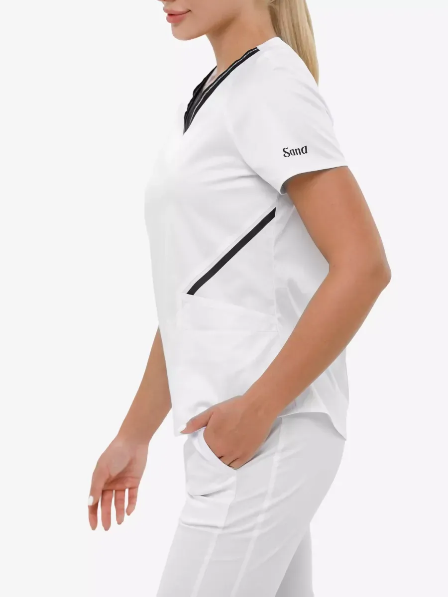Ця модель вирізняється спортивним стилем, притаманним сучасному медичному одягу. Еластичний матеріал забезпечує повну свободу рухів, що є важливим для активної роботи в клініках чи лікарнях. Яскраві акценти на костюмі не лише підкреслюють унікальність дизайну, але й створюють позитивний настрій у робочому середовищі.