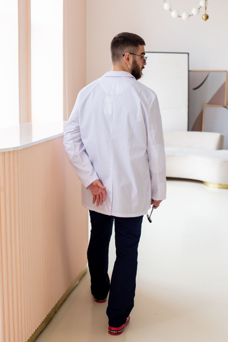 Замовляйте чоловічий медичний халат-піджак 206 від IN WHITE у магазині Медтехніка Хуст та відчуйте комфорт і стиль кожного робочого дня!
